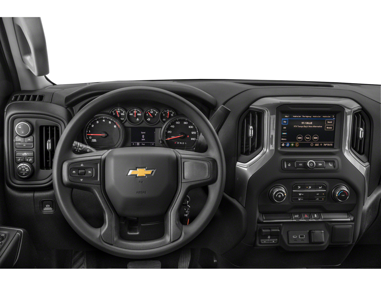 INFOTAINMENT PACKAGE includes (U2K) SiriusXM Radio and (UE1) OnStar, CUSTOM VALUE PACKAGE includes (PCX) Custom Convenience Package, (ZLA) Infotainment Package, (DWI) outside power-adjustable vertical trailering mirrors with heated and auto-dimming upper glass, lower convex spotter mirrors, turn signal indicators, puddle lamps, perimeter lighting and power folding/manual extending and (DD8) auto-dimming rearview mirror, CUSTOM CONVENIENCE PACKAGE includes (BTV) Remote Start, (C49) rear-window defogger, (UF2) bed LED cargo area lighting, (QT5) EZ Lift power lock and release tailgate and (JL1) Trailer brake controller , LICENSE PLATE KIT, FRONT, LED CARGO AREA LIGHTING located in pickup bed, activated with switch on center switch bank or key fob, JET BLACK, CLOTH SEAT TRIM, GVWR, 10,650 LBS. (4831 KG), ENGINE, 6.6L V8 with Direct Injection and Variable Valve Timing, gasoline, (401 hp [299 kW] @ 5200 rpm, 464 lb-ft of torque [629 N-m] @ 4000 rpm) (STD), DEFOGGER, REAR-WINDOW ELECTRIC, CUSTOM PREFERRED EQUIPMENT GROUP includes standard equipment, AUDIO SYSTEM, CHEVROLET INFOTAINMENT 3 SYSTEM 7" diagonal color touchscreen, AM/FM stereo. Additional features for compatible phones include: Bluetooth® audio streaming for 2 active devices, voice command pass-through to phone, Apple CarPlay and Android Auto capable. (STD), 4G LTE WI-FI HOTSPOT CAPABLE, Windows, power rear, express down, Window, power front, passenger express down, Window, power front, drivers express up/down, USB port, located on instrument panel, Transmission, 6-speed automatic, heavy-duty, Transfer case, two-speed electronic shift with push button controls (Requires 4WD models.), Tires, LT275/65R20 all-terrain, blackwall, Tire, spare LT275/70R18 all-terrain, blackwall.