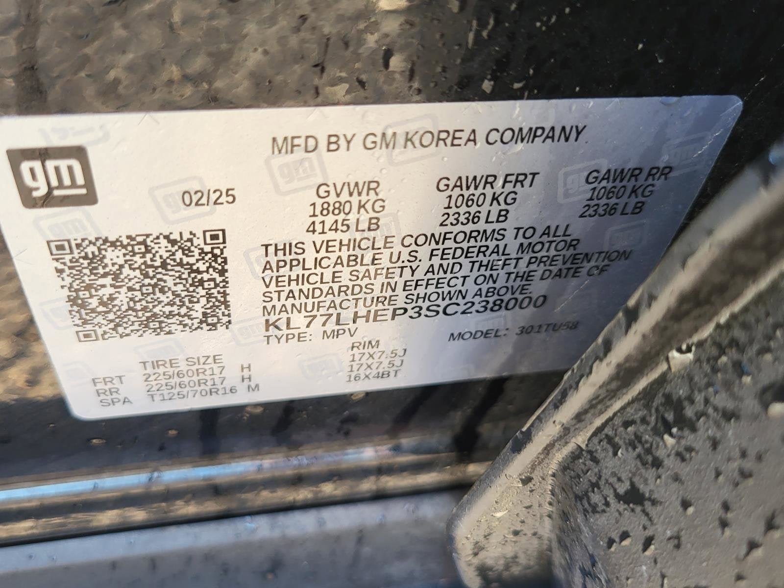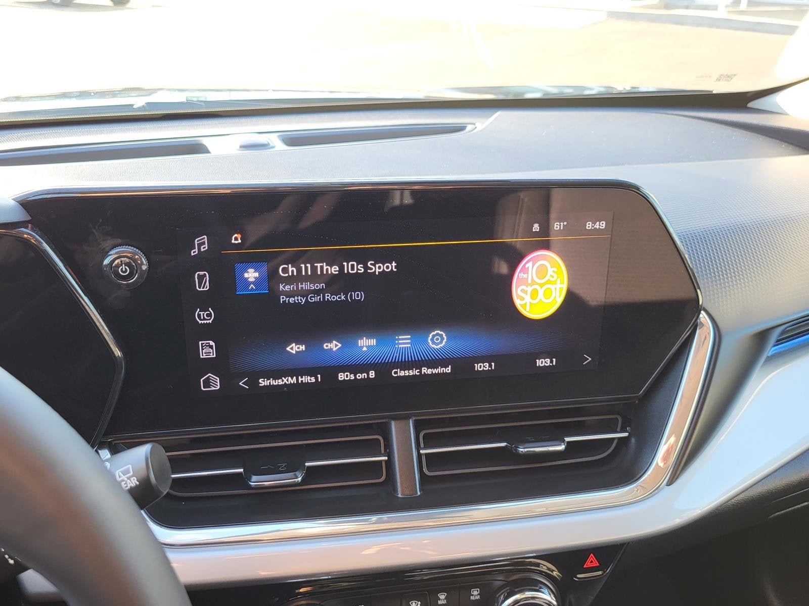 LICENSE PLATE FRONT MOUNTING PACKAGE , JET BLACK WITH BLUE ACCENTS, CLOTH/EVOTEX SEAT TRIM, ENGINE, ECOTEC 1.2L TURBO DOHC DI WITH VARIABLE VALVE TIMING (VVT) E85-compatible (137 hp [102 kW] @ 5000 rpm, 162 lb-ft torque [219 N-m] @ 2500 rpm) (STD), AXLE, 3.50 FINAL DRIVE RATIO, AUDIO SYSTEM, 11" DIAGONAL HD COLOR TOUCHSCREEN AM/FM stereo. Additional features for compatible phones include: Bluetooth® audio streaming for 2 active devices, voice command pass-through to phone, wireless Apple CarPlay and wireless Android Auto capable (STD), Wireless Apple CarPlay/Wireless Android Auto, Wipers, front intermittent, variable speed, Wiper, rear, intermittent, Windows, power rear, express down, Window, power, front passenger with express down, Window, power, driver with express down, Wi-Fi Hotspot capable (Terms and limitations apply. See onstar.com or dealer for details.), Wheels, 17" (43.2 cm) Gray-painted machined aluminum, Wheel, spare, 16" (40.6 cm) steel, Visors, driver and front passenger vanity mirrors, covered, Vehicle health management, USB ports, 2, one type-A and one type-C, located within the instrument panel, USB ports, 2, one type-A and one type-C, center console, charge-only, rear, Transmission, 6-speed automatic, Tires, 225/60R17 all-season, blackwall.